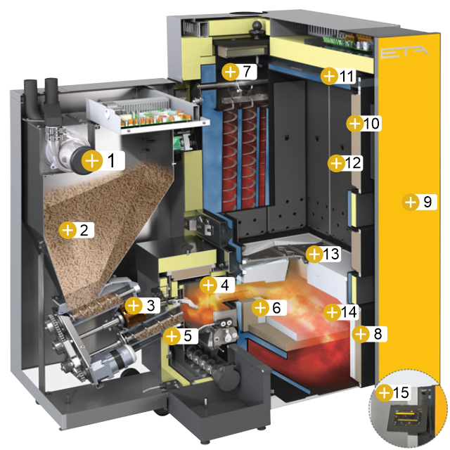 Auch im Pelletsbrenner erkennt die Lamdasonde die Beschaffenheit des Brennmaterials. In beiden Geräten sorgen effiziente Systeme für ein problemloses und teils automatisches Reinigen und Entaschen. Das ist Komfort mit Geldsparplus!